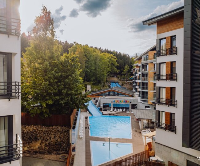 The outdoor complex includes a large heated swimming pool, a family waterslide, a cascade, a heated children's pool and outdoor jacuzzis. The internal part consists of: a large swimming pool with a multimedia slide, an artificial river and geysers. For children there is a two-deep pool with a slide, hedgehogs and a mushroom. The water complex is complemented by a relaxation zone, which is a place for people looking for peace and relaxation.