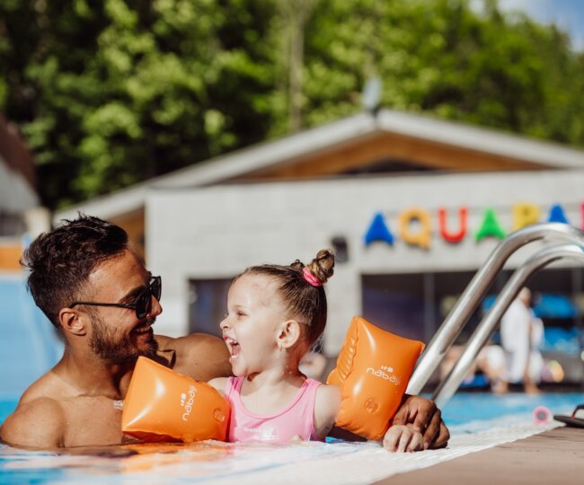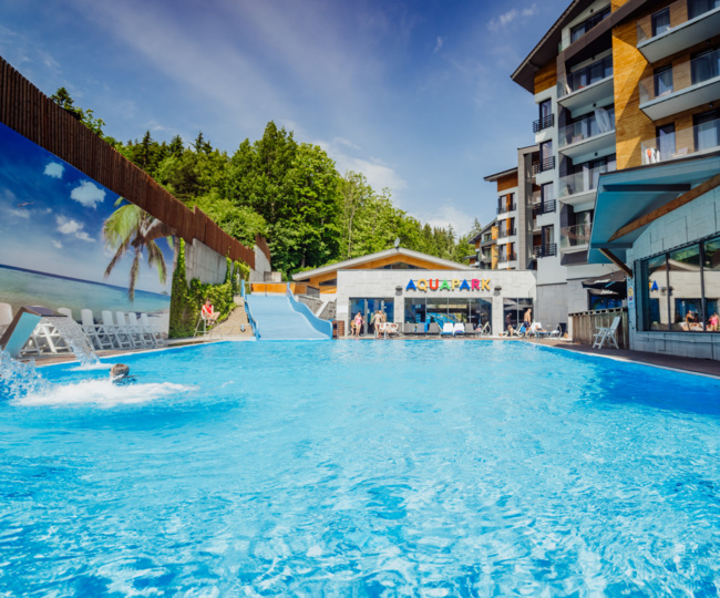 The outdoor complex includes a large heated swimming pool, a family waterslide, a cascade, a heated children's pool and outdoor jacuzzis. The internal part consists of: a large swimming pool with a multimedia slide, an artificial river and geysers. For children there is a two-deep pool with a slide, hedgehogs and a mushroom. The water complex is complemented by a relaxation zone, which is a place for people looking for peace and relaxation.