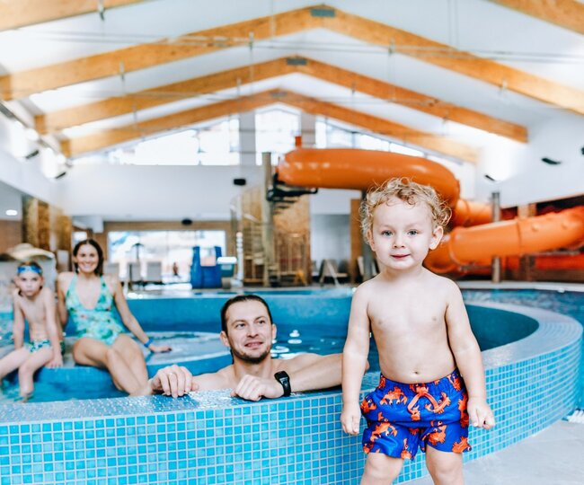 dostęp do Strefy Basenowej: multimedialna zjeżdżalnia wewnętrzna, zjeżdżalnia zewnętrzna, basen rzeka, brodziki dla najmłodszych, Jacuzzi, osobna strefa saun dla osób dorosłych